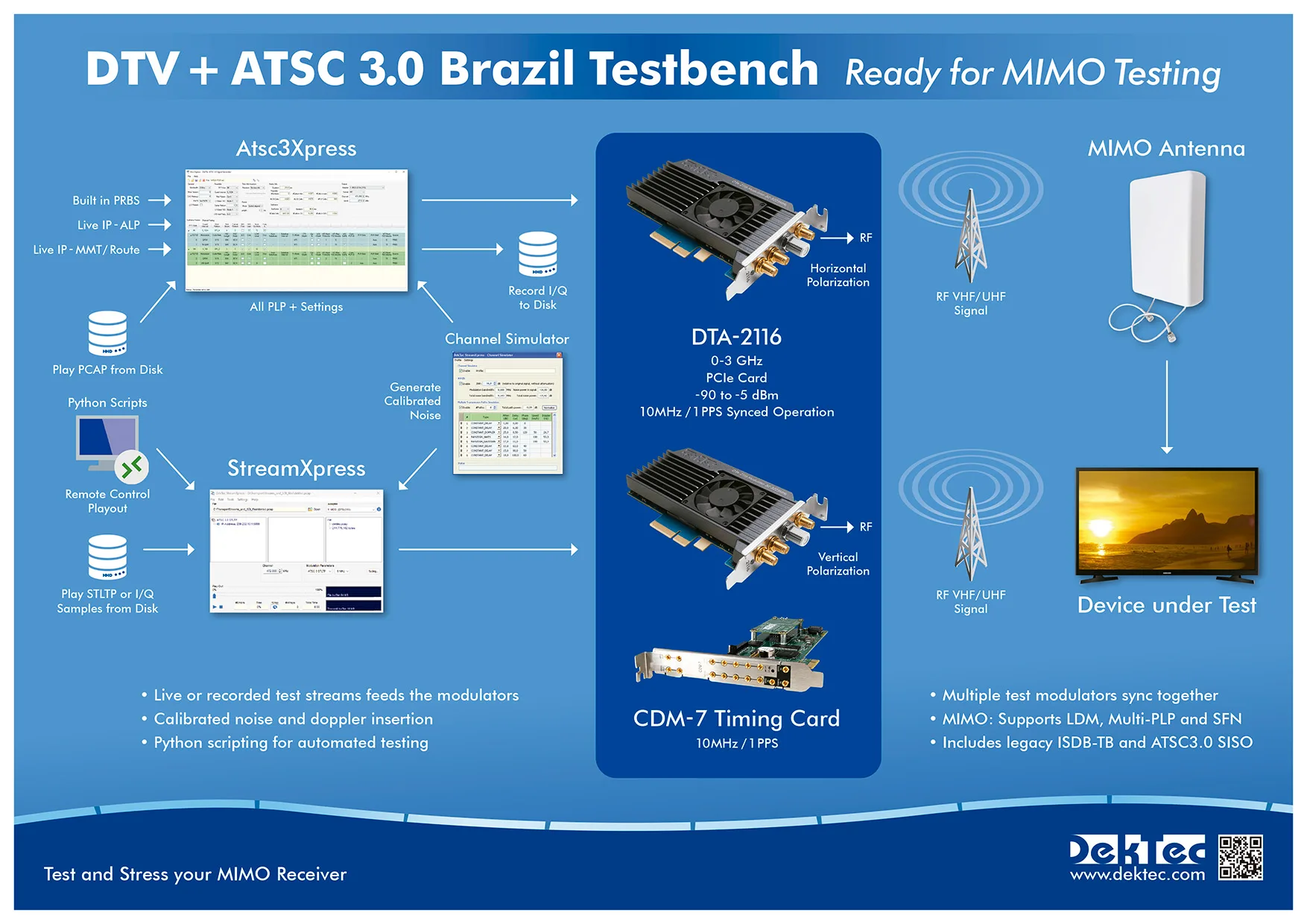 O sistema de testes descrito no documento “DekTec ATSC3 MIMO Brazil handout” é uma plataforma completa para validação e certificação de receptores e transmissores compatíveis com o padrão ATSC 3.0 MIMO, projetada para atender às exigências técnicas da TV 3.0 no Brasil. Ele possibilita a simulação precisa de condições reais de recepção, garantindo que os dispositivos sejam avaliados com base em parâmetros controlados e representativos do ambiente de operação.